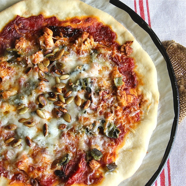 To make this vegetarian, just omit the chicken and stir two tablespoons of the BBQ sauce into the tomato sauce. Scatter a few Roasted Balsamic Tomato halves on top of the tomato sauce, and increase the amount of poblano peppers. I also recommend laying on an additional cheese. Having two different cheeses can bring a nice depth of flavor to the pizza.