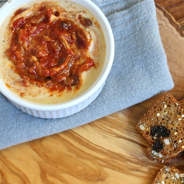 This hummus is good all by itself, but I had some Balsamic Roasted Tomatoes hanging out in the refrigerator, and stirred them in. So, so good, and so much more fresh than any store-bought hummus I've had.