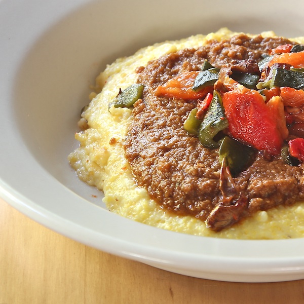 Comforting cheesy polenta topped with a mole sauce and roasted peppers.