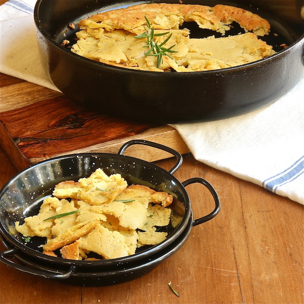 Farinata flatbread is a traditional Italian appetizer, reminiscent of a savory crepe using chickpea flour, flavored with garlic and rosemary. Think of it as chickpea pancakes.