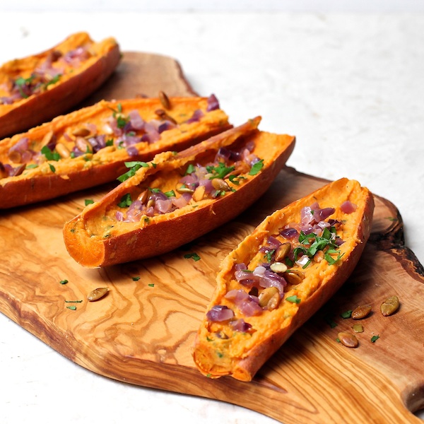 Savory sweet potato skins packed with cheese and caramelized onions.