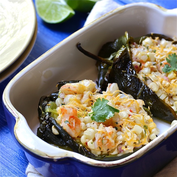 Every summer when fresh peppers and corn show up at the market, I think about making this dish. The poblano peppers take a little effort to roast, peel, slit open and stuff, but it's all quick work if you roast the peppers earlier in the day. The warm corn salad can be made ahead as well. And the "wow!" effect you'll get at the table will be well worth the effort.