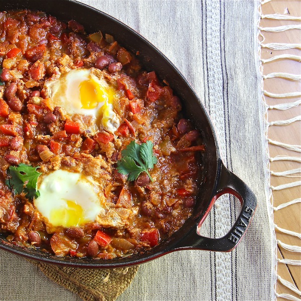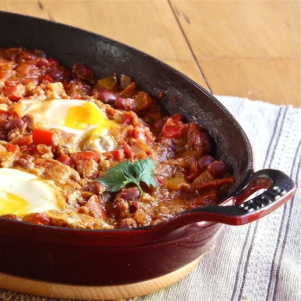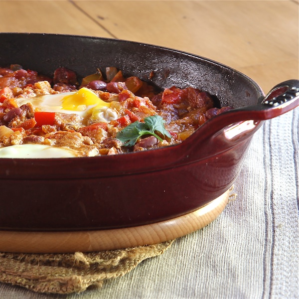 There are a couple of ways to add the eggs. Most recipes call for cooking off some of the liquid so that the chiliย is thick, forming a hollow with a spoon, and plopping a raw egg into the hollow. Simmer the chiliย until the egg white becomes solid, but not so long that the yolk completely hardens.