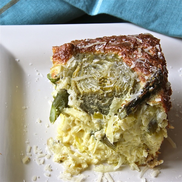 This soft, fluffy egg bake is loaded with asparagus, leeks and potatoes, and topped with artichokes. The casserole is light and fluffy from folding whipped egg whites into the egg batter, similar to this Asparagus Gruyere Quiche.