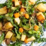 Toss the apples, kale, butternut, bread, and caramelized onions together in a large bowl. Add the cranberries and pepitas, and dress with the Apple Vinaigrette.