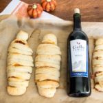 For the mummy bindings, slice the dough into 1" wide strips on either side of the Sauce and cheese.