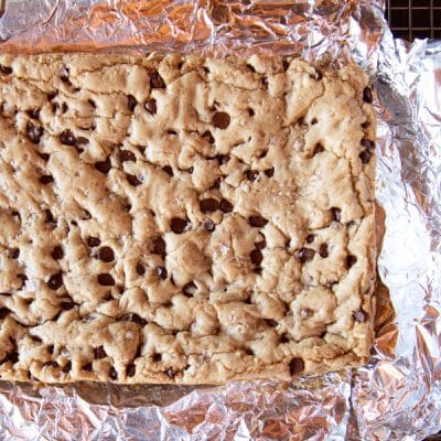 After 10 minutes, use the foil sling to carefully lift the cooked cookie bars from the baking pan onto the cooling rack. Wait at least 5 more minutes before cutting them into squares using a sharp knife. At that point the foil should easily come away from the bars.