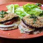 Firmly hold each eggplant sandwich and coat first in the egg on both sides; then coat in the breadcrumb mixture. Place on the baking sheet.