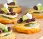 This little appetizer is all about the potato, but feel free to adjust how much nacho fixings you want to add. The potato stacks are thick enough to be eaten as finger food, but are a little messy. Be sure to have napkins nearby.