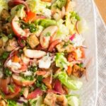 A twist on the traditional Italian Bread Salad. The original form uses tomatoes and stale (or toasted) bread. This version adds ripe peaches, basil and mint to the mix. This recipe makes 2 main dish salads or 4 - 6 sides.
