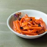 Slice the carrots lengthwise into 4 long strips. Toss with the oil and maple syrup and lay on the parchment paper in a single layer. Roast for 20 minutes, toss, and roast another 20 minutes or until lightly caramelized.