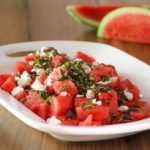 Cut away the green and white rind layers from the watermelon, and slice into 1-inch cubes. Lay on a serving dish.